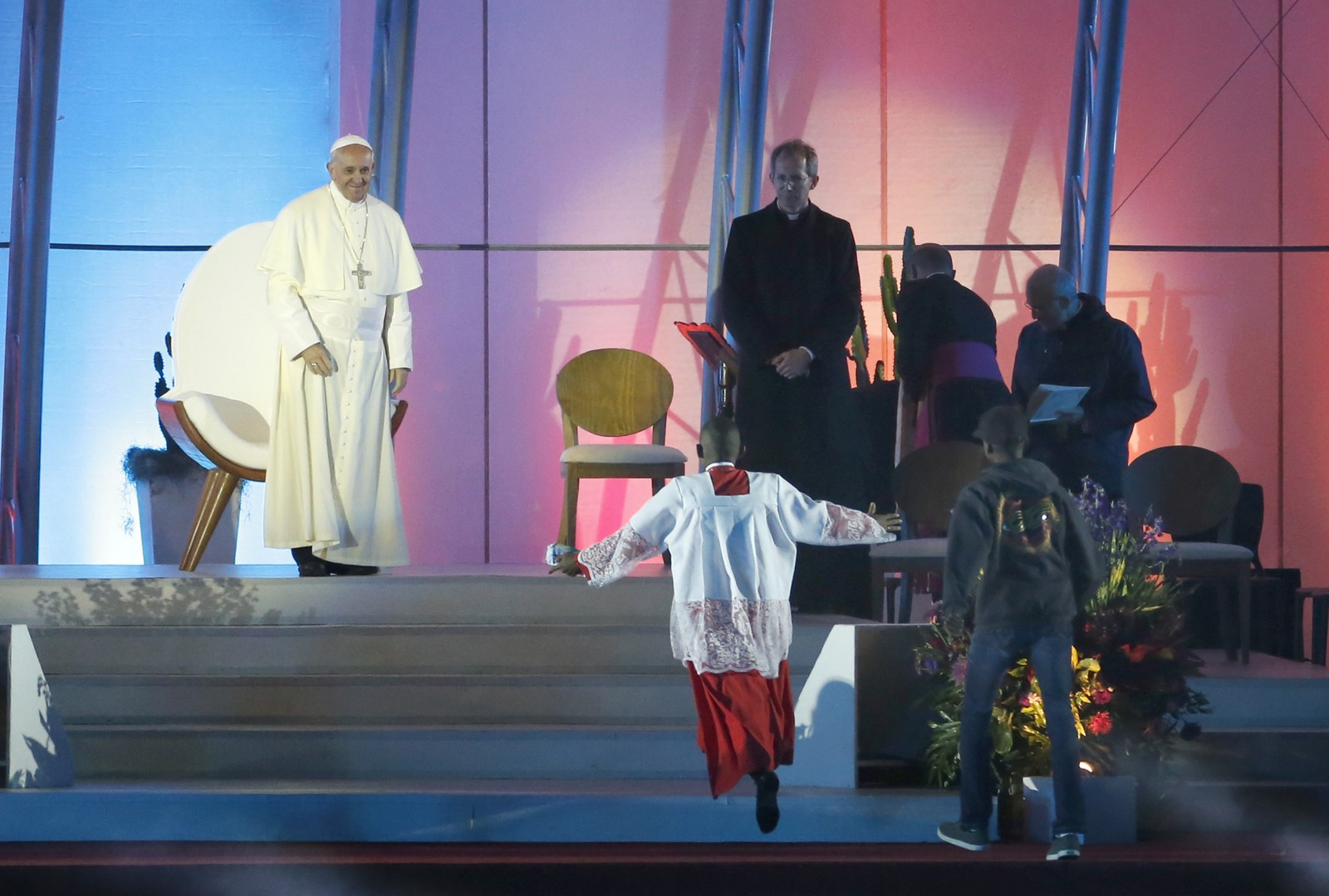 Papa Francisco usa uma guirlanda de pescoço dada a ele durante sua visita à favela da Varginha,no Rio de Janeiro,em 25 de julho de 2013 — Foto: LUCA ZENNARO / AFP