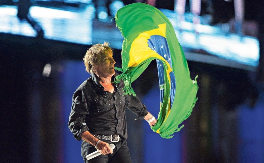 No Rock in Rio de 2015,Rod cumpriu o ritual de quase todo gringo que se apresenta por aqui: posou com uma bandeira (no caso,uma canga) do Brasil — Foto: Márcio Alves
