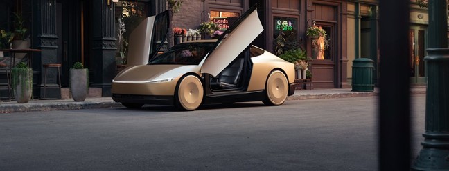 Tesla Robotaxi tem "portas tesoura",que se abrem para cima — Foto: Reprodução / Tesla