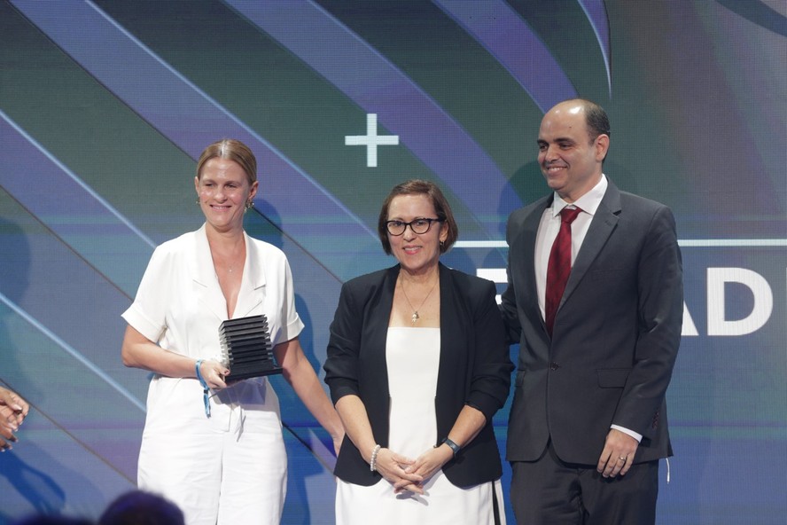 Telma Vinha,premiada na categoria Educação,recebeu o troféu das mãos de Katia Repsold,country manager da Naturgy,e do colunista Bernardo Mello Franco — Foto: Alexandre Cassiano