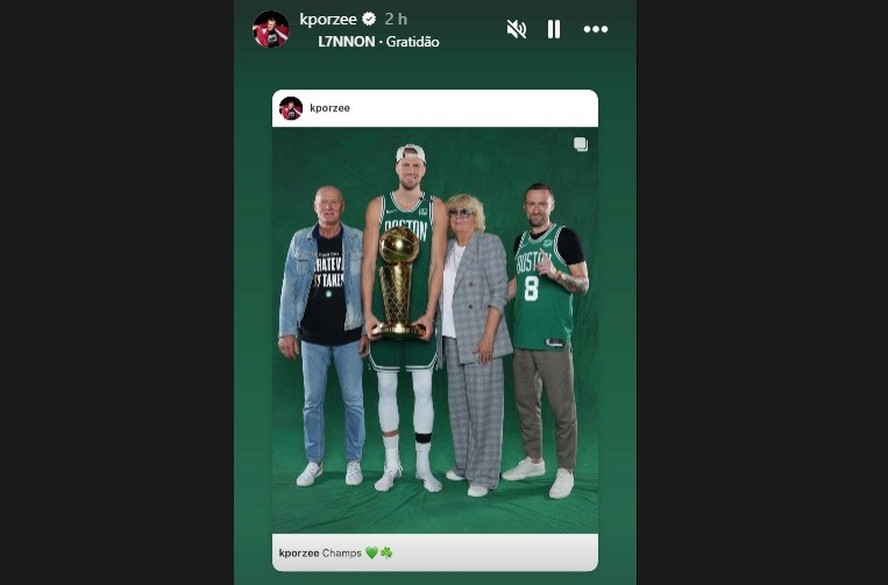 Em um story em sua conta no Instagram,o ala-pivô Kristaps Porzingis mostra um registro dele erguendo o troféu de campeão da liga ao lado dos pais e de um irmão,ao som de uma música do brasileiro L7nnon.