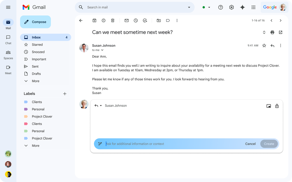 Exemplo do uso do Gemini integrado ao Gmail — Foto: Divulgação/Google