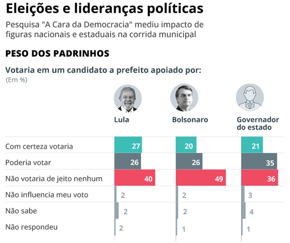 No caso do ex-presidente,49% rejeitam votar em um candidato que receba seu apoio. Os que ao menos consideram votar em um aliado de Bolsonaro são 46%,mas apenas dois em cada dez eleitores dizem que o apoio garantiria seu voto. Os governadores são rejeitados como “padrinhos” por 36% dos entrevistados,enquanto 21% garantem votar em alguém com seu apoio.