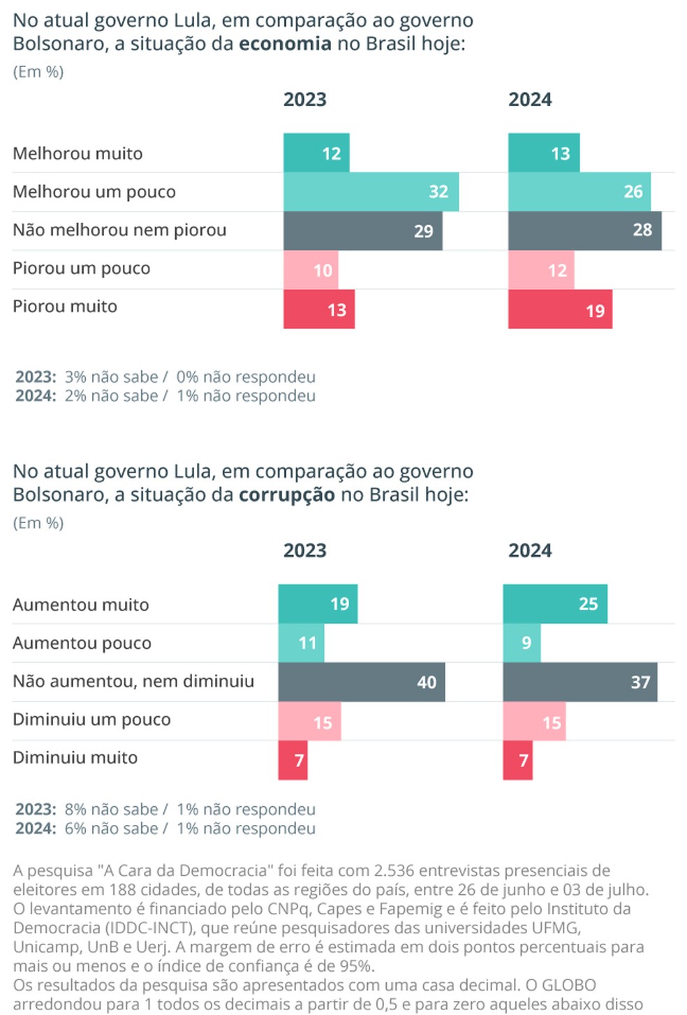 Segundo a pesquisa,há uma percepção maior de melhora do que de piora da economia no governo Lula — embora o índice dos que consideram que a situação “piorou muito” tenha avançado em 2024. A sensação de maior corrupção também avançou neste ano.