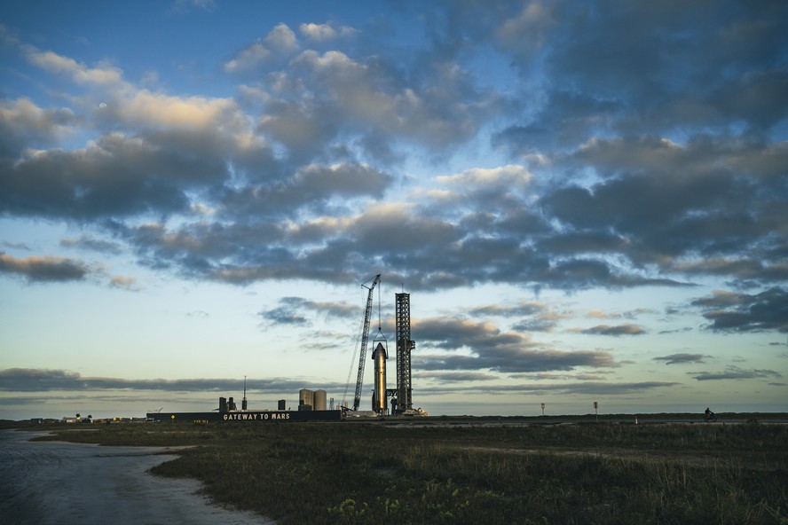 Starship,um foguete reutilizável de quase 400 pés,atracou nas instalações da SpaceX em Boca Chica,Texas,em 21 de fevereiro de 2024 — Foto: Meridith Kohut/The New York Times