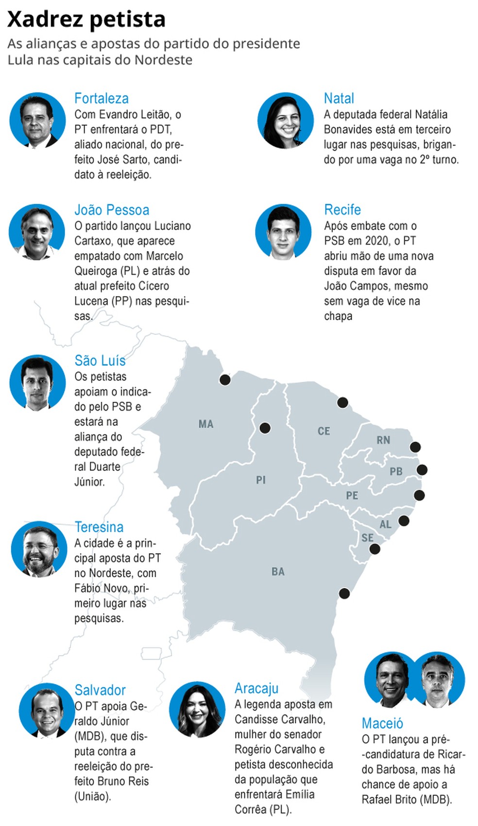 Em Natal,a deputada federal Natália Bonavides (PT-RN) aparece em pesquisas internas com chances de ir ao segundo turno,situação semelhante à do ex-prefeito Luciano Cartaxo (PT) em João Pessoa. Já em Aracaju,a pré-candidata do partido é Candisse Carvalho,ainda desconhecida da população. Ela enfrentará a candidata do PL,Emília Corrêa,até agora mais bem posicionada na disputa.