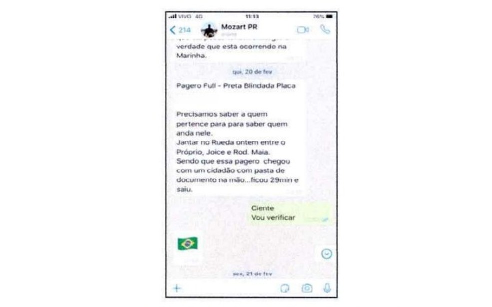 Em fevereiro de 2020,Mosart Aragão Pereira,que era assessor especial do gabinete de Bolsonaro na Presidência,enviou a Ramagem informações sobre um veículo e acrescentou: "Precisamos saber a quem pertence para saber quem anda nele. Jantar no Rueda ontem entre o próprio,Joice e Rodrigo Maia. Sendo que essa Pajero chegou com um cidadão com pasta de documento na mão...ficou 29 min e saiu".