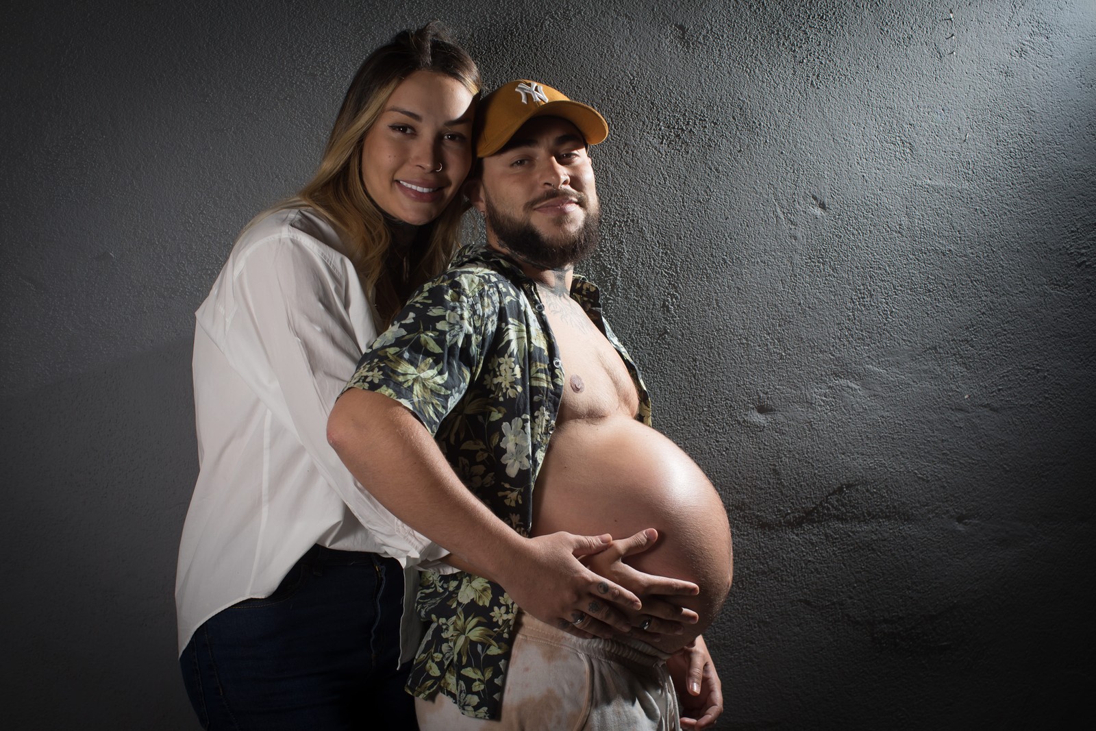 Érika abraça a o barrigão de grávido de Roberto,um homem trans que aguarda o nascimento de Noah — Foto: Edilson Dantas / O Globo