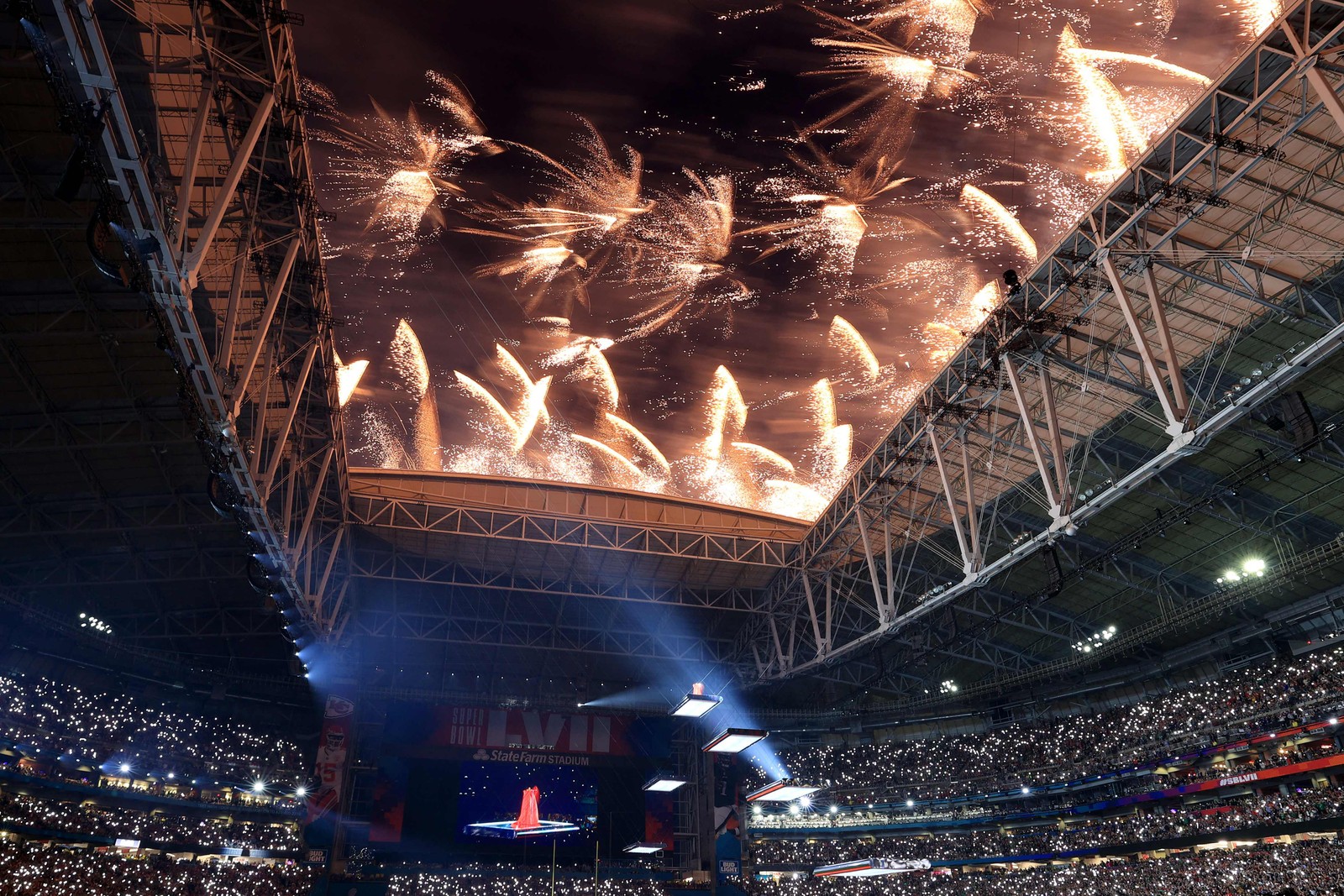 Show pirotécnico durante apresentação de Rihanna no Super Bowl — Foto: TIMOTHY A. CLARY/AFP