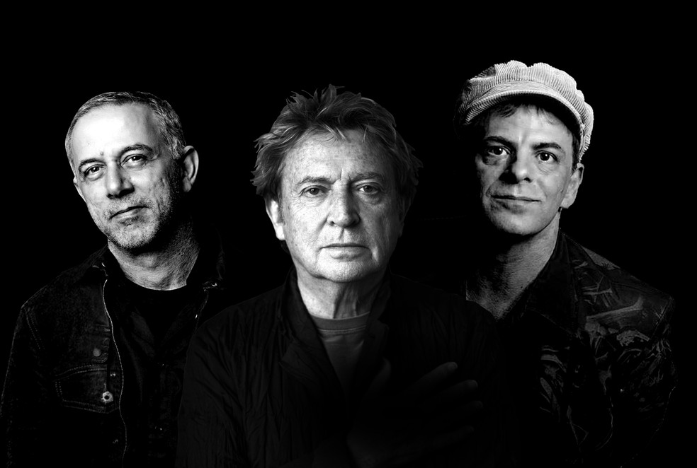 Andy Summers (centro),com João Barone (à esq.) e Rodrigo Santos no grupo Call The Police — Foto: Divulgação