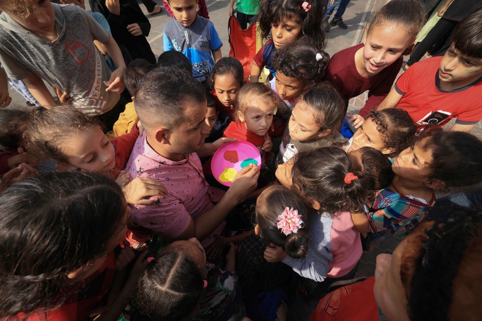 Crianças palestinas que fugiram de suas casas devido aos ataques israelenses têm seus rostos pintados durante jogos organizados por trabalhadores humanitários enquanto se abrigam em uma escola administrada pelas Nações Unidas,em Khan Yunis,no sul da Faixa de Gaza — Foto: Mahmud HAMS / AFP