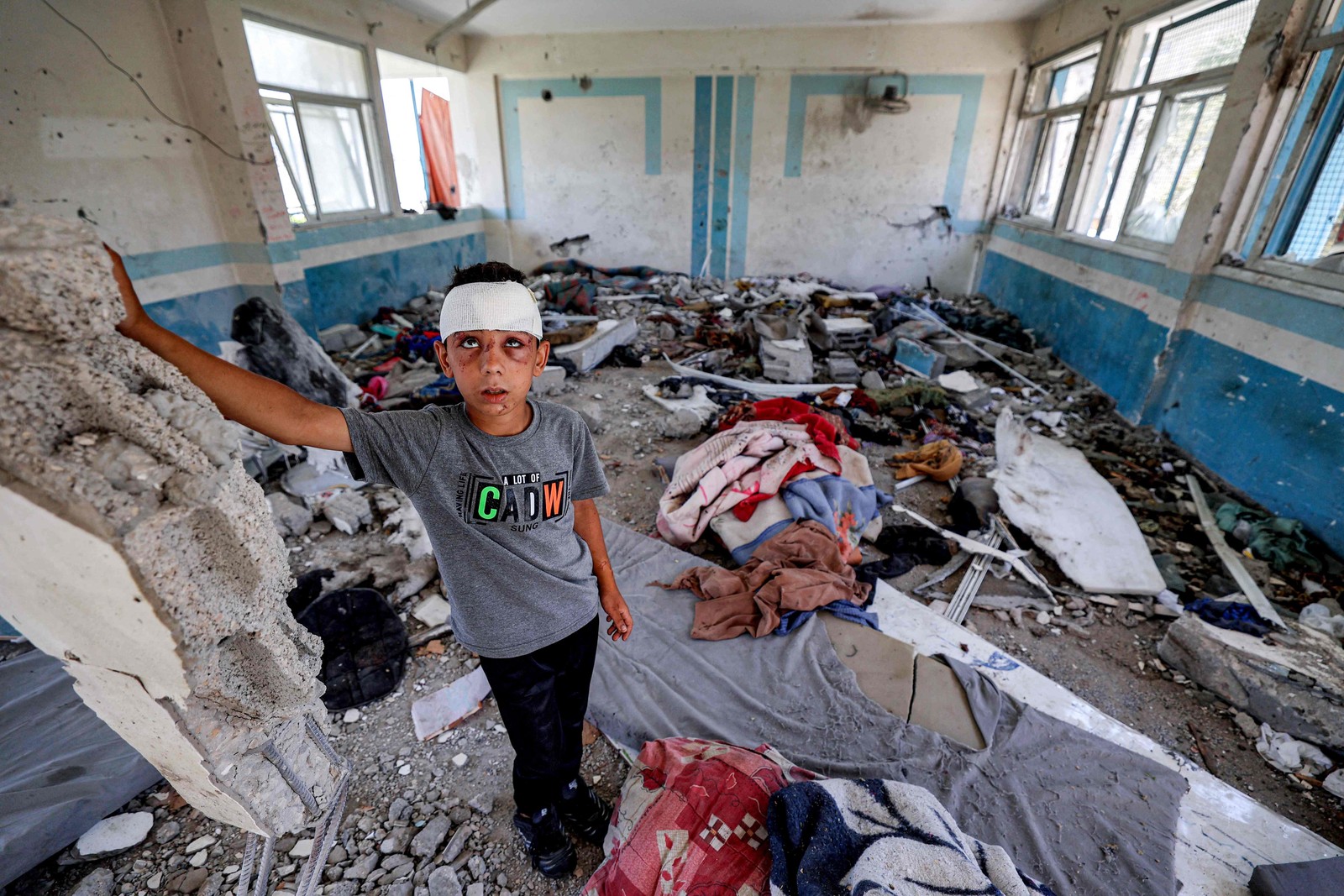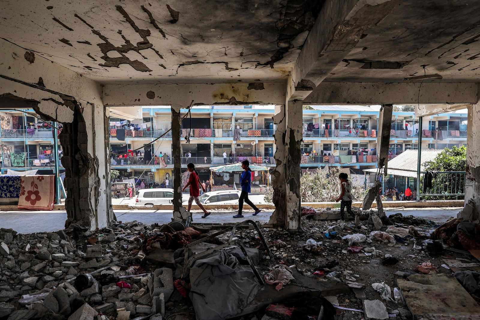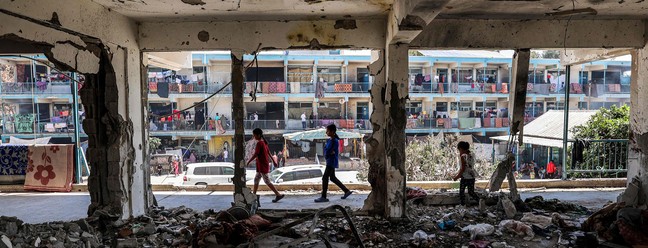 Crianças passam por uma sala de aula destruída,onde foram colocados colchões para as pessoas abrigadas em uma escola administrada pela Agência de Assistência e Obras da ONU para os Refugiados da Palestina (UNRWA) — Foto: Eyad BABA / AFP