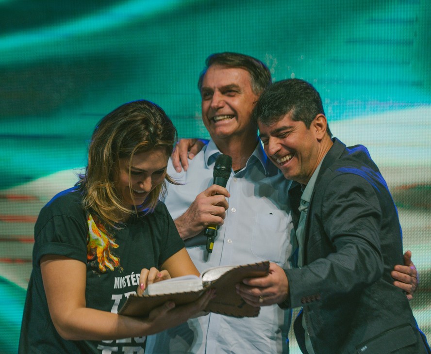 Pastor Josué Valandro Junior com Bolsonaro e Michelle na Igreja Atitude — Foto: Divulgação RESUMOSem tempo? Ferramenta de IA resume para você