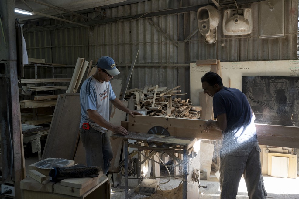 Trabalhadores cortando madeira na oficina de produção da Dforja Creations,uma empresa privada de móveis nos arredores de Havana,em 10 de fevereiro de 2024 — Foto: Eliana Aponte Tobar/The New York Times