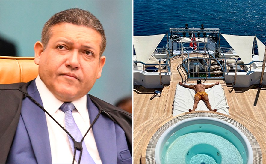 O ministro do STF Kassio Nunes Marques e o cantor Gusttavo Lima no iate que alugou na Grécia para celebrar seu aniversário — Foto: Montagem O GLOBO