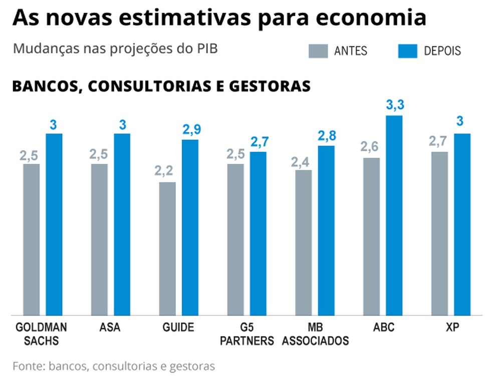 A surpresa com crescimento de 1,4% do Produto Interno Bruto (PIB) no segundo trimestre,bem acima da expectativa média de 0,9%,levou a uma série de revisões para cima nas projeções para o desempenho da economia este ano. Analistas de mercado esperam alta em torno de 3% e já há analista prevendo crescimento de 3,3%.