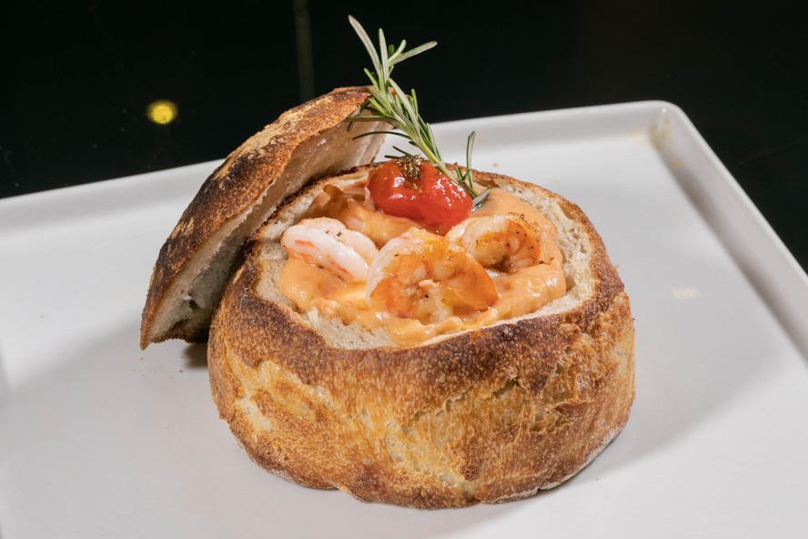 No pão rústico. O Parla! (3439-9188) oferece o creme de camarão com alho-poró (R$ 39,90) — Foto: Divulgação/Eduardo Duarte