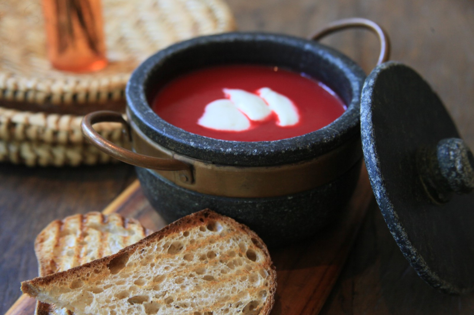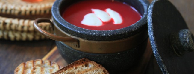 Sopa fria. De beterraba com iogurte acompanhada de fatia de pão sourdough (R$ 36) no Zazá Bistrô (@zazabistrocafe) — Foto: Divulgação/Gabriela Temer