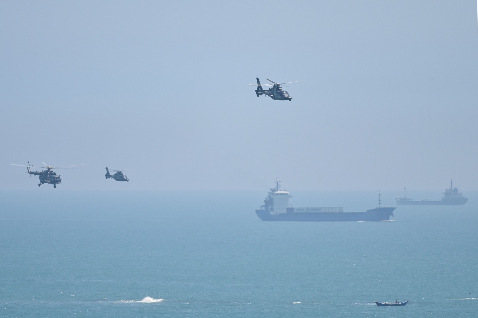 Helicóptero militar chinês sobrevoa a ilha de Pingtan,na província de Fujian — Foto: Hector RETAMAL/AFP