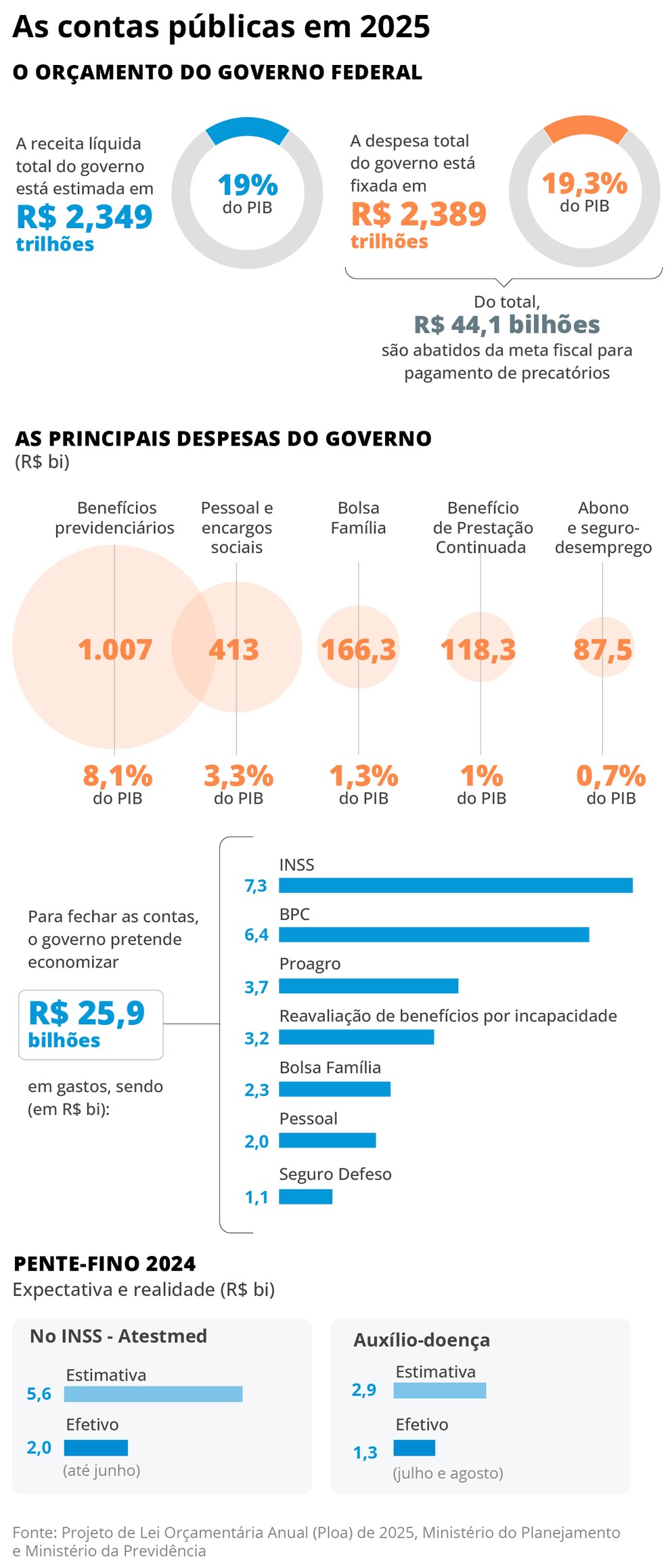 Outros R$ 10,5 bilhões têm,mais uma vez,foco no auxílio-doença (Atestmed,reavaliação e medidas cautelares). Há ainda contribuições previstas do Bolsa Família (R$ 2,3 bilhões),gastos com pessoal (R$ 2 bilhões),Proagro (R$ 3,7 bilhões) e seguro-defeso (R$ 1,1 bilhão). Este último depende de aprovação de medidas pelo Congresso.