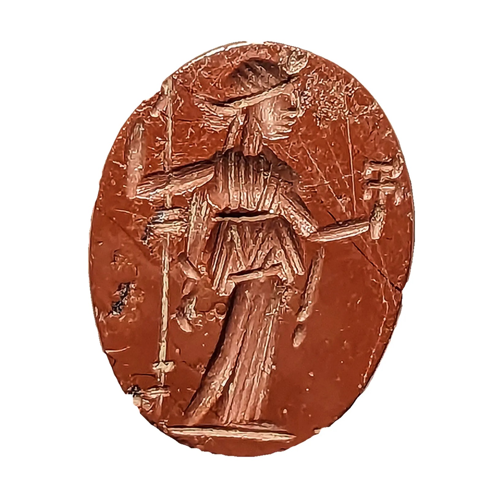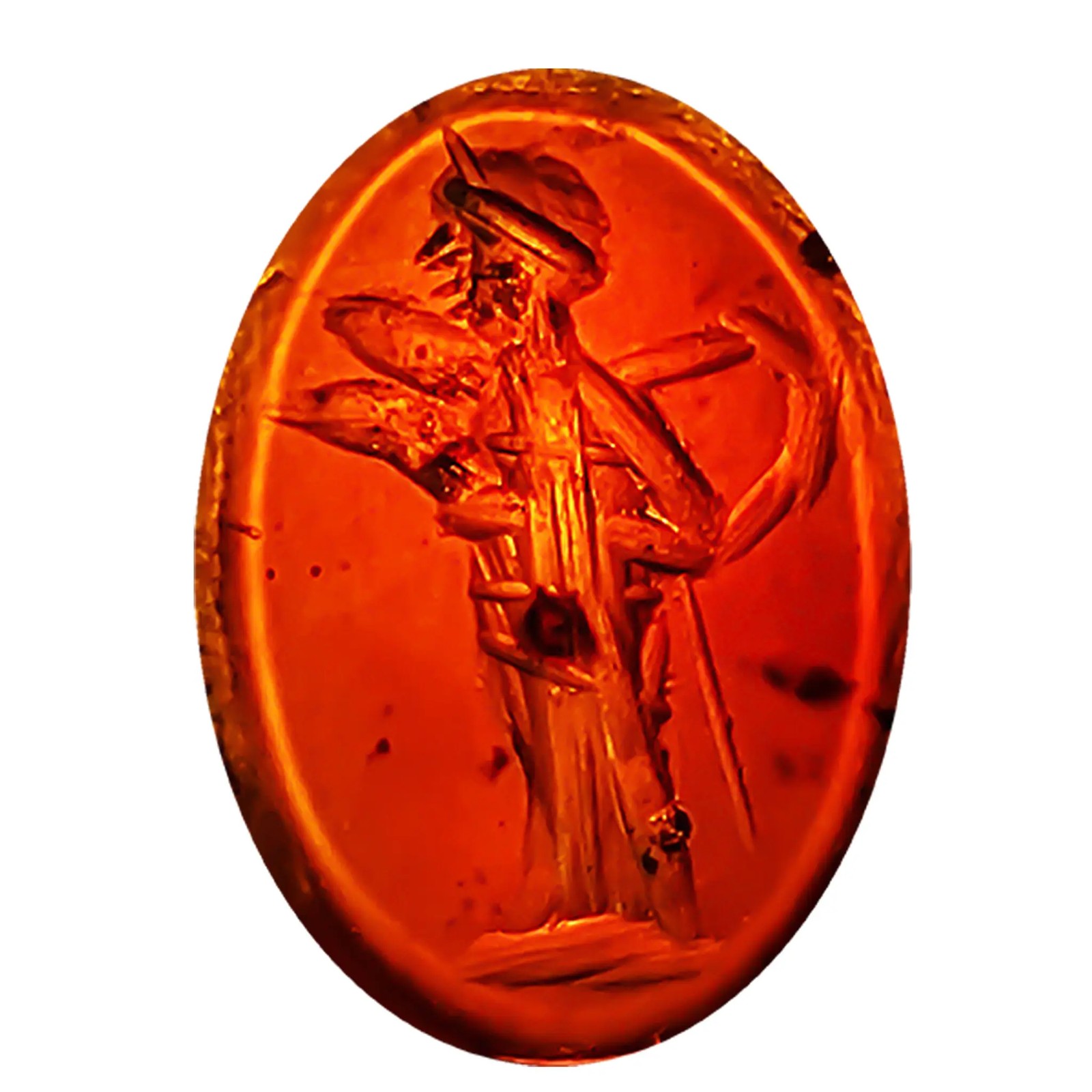 Ceres,gravada em jaspe vermelho,veste uma túnica com cinto e segura um cetro na mão esquerda — Foto: Anna Giecco