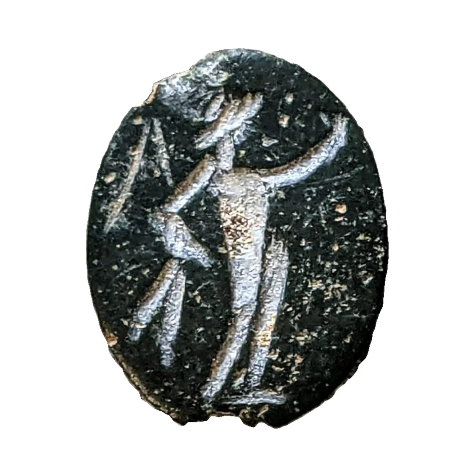 Um anel de bronze contendo um entalhe de vidro azul moldado representando uma figura masculina — Foto: Anna Giecco