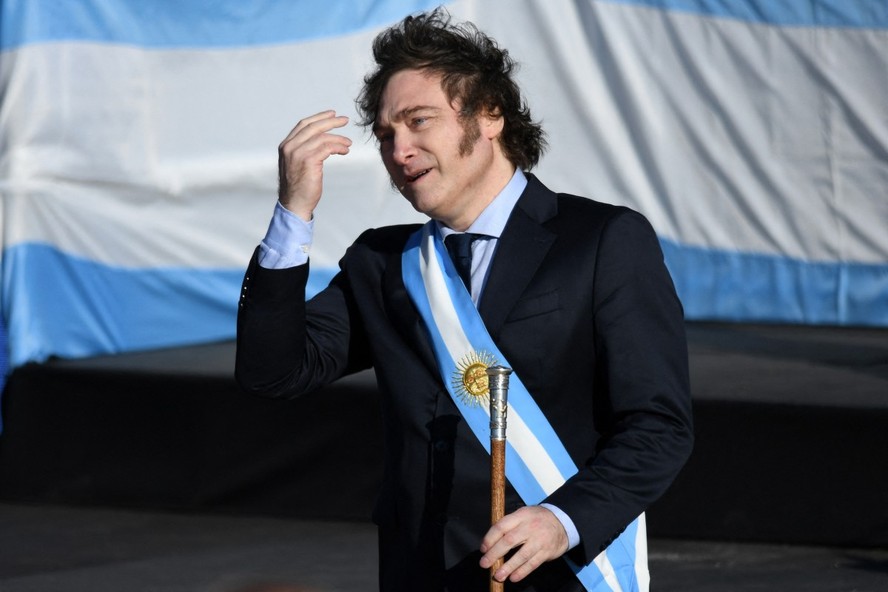 O presidente da Argentina,Javier Milei,durante comemorações do Dia da Bandeira no Memorial da Bandeira Nacional em Rosário,Santa Fé,Argentina,— Foto: STRINGER/AFP