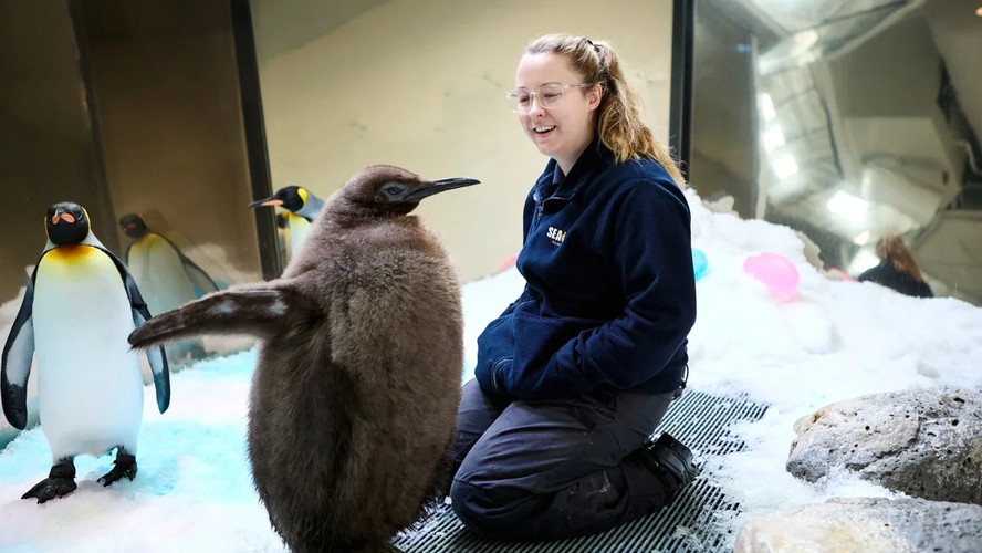 Pesto,o pinguim-rei de apenas nove meses,pesa 22,5kg e já é maior que seus pais. Por meio das redes sociais do Sea Life Melbourne Aquarium,na Austrália,o bebê gigante virou uma celebridade. Com seus 90 centímetros de altura e seu corpo ainda "peludo",como é comum para os filhotes da espécie,ele conquistou o público do aquário.