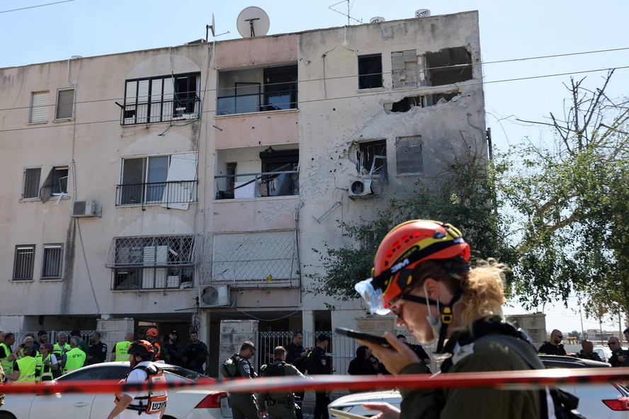 Forças de segurança israelenses isolam área em frente a um prédio danificado por foguete disparado do Líbano,no distrito de Haifa,em 19 de outubro — Foto: Jack GUEZ / AFP
