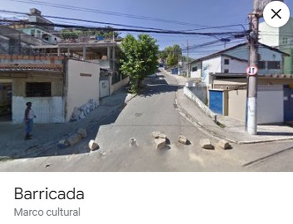 Barricada na Rua Curuira,em Vicente de Carvalho,aparece como "marco cultural" no Google Maps — Foto: Reprodução
