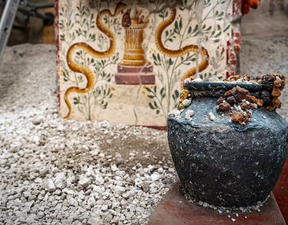 Eles também destacaram que foram encontrados “objetos rituais dentro do nicho,deixados com a última oferenda antes da erupção de 79 d.C.,que destruiu Pompeia. Entre eles,foram resgatados: um queimador de perfume em cerâmica acroma com fendas antigas e uma lamparina,ambos com evidentes marcas de queimadura.”