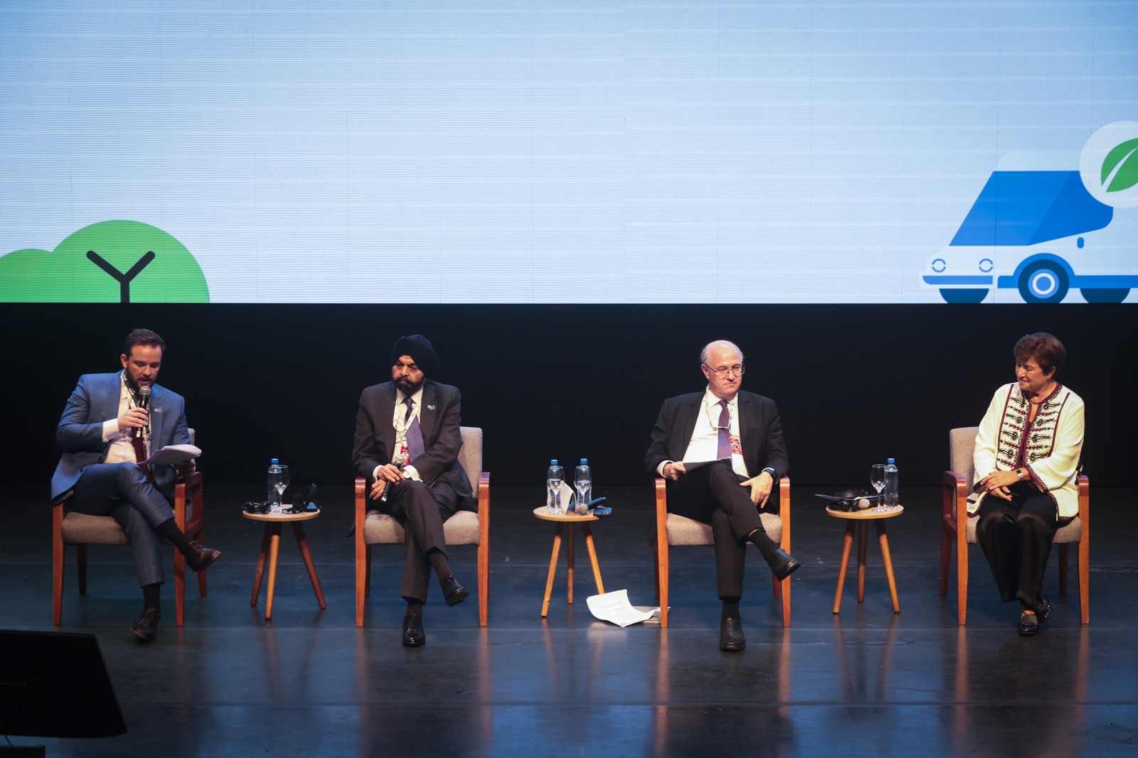 Na foto: Dario Durigan,secretá¡rio executivo do Ministério da Fazenda,Ajay Banga,Presidente do Grupo do Banco Mundial e vice-presidente da General Atlantic. Ilan Goldfajn,Presidente do Banco Interamericano de Desenvolvimento e Kristalina Georgieva,atual diretora-geral do Fundo Monetário Internacional. — Foto: Maria Isabel Oliveira / Agência O Globo