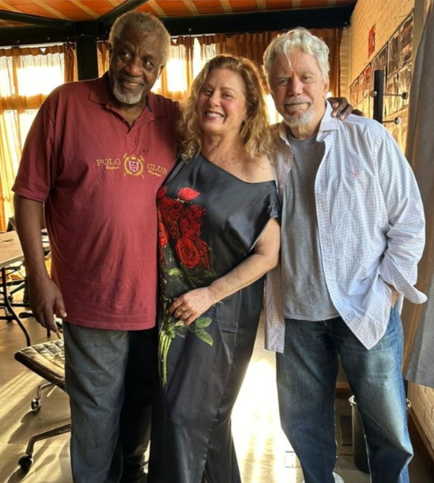 Tony Tornado,Vera Fischer e Reginaldo Faria nos bastidores de 'Velhos bandidos' — Foto: Divulgação