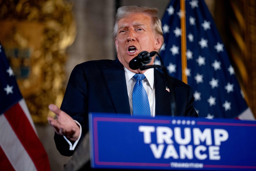 Presidente eleito dos EUA,Donald Trump,durante entrevista coletiva em Mar-a-Lago,na Flórida — Foto: Andrew Harnik/Getty Images/AFP