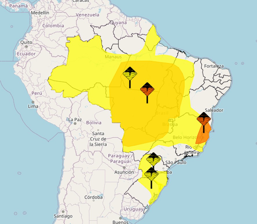 Os alertas de maior impacto estão espalhados pelas regiões Norte,Nordeste,Centro-Oeste e Sudeste. A região Sul não será afetada por ele. Isso indica que haverá chuva entre 30 e 60 mm/h,ventos intensos de até 100km/h. Além disso,há risco de corte de energia elétrica,queda de galhos de árvores,alagamentos e de descargas elétricas.