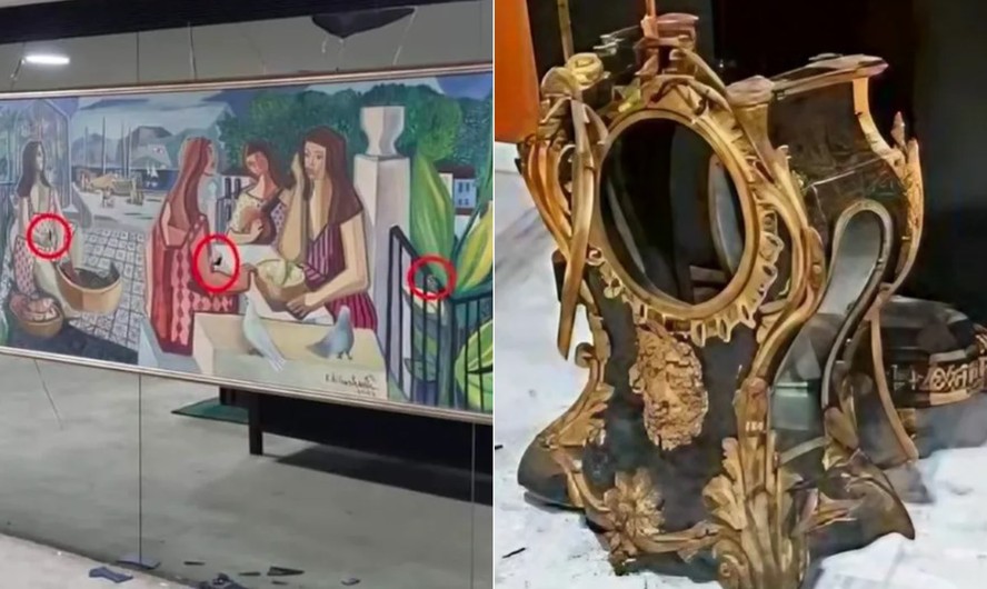 À esquerda,a tela 'As mulatas',de Di Cavalcanti,furada em seis pontos; à direita,relógio de Dom João VI destruído — Foto: Reprodução