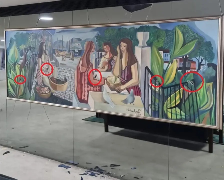 Feita em 1962,a obra foi danificada por seis perfurações feitas à faca pelos invasores