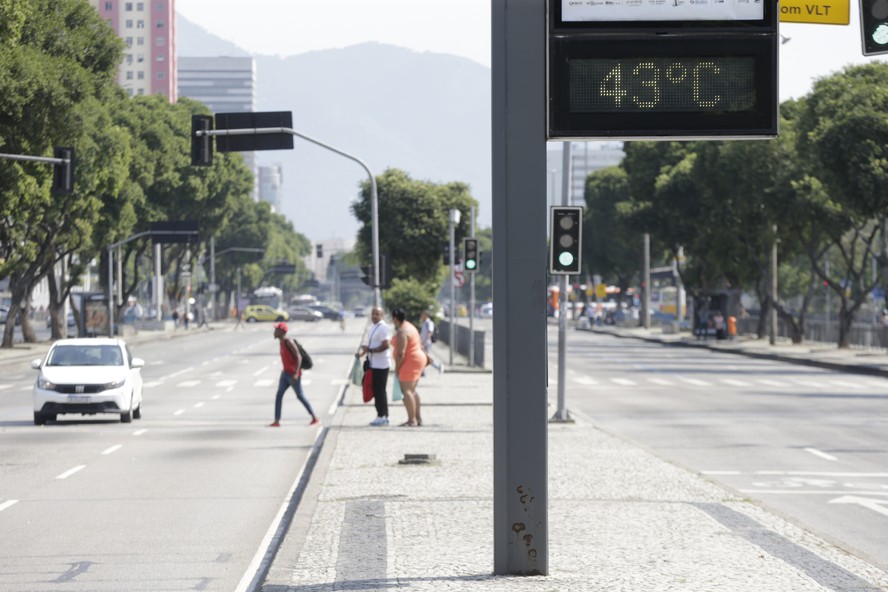 Termômetro marca 43ºC na Avenida Presidente Vargas,no Centro do Rio — Foto: Custódio Coimbra Veja este dado curioso da variação climática na cidade do Rio de Janeiro em 2024. A menor temperatu