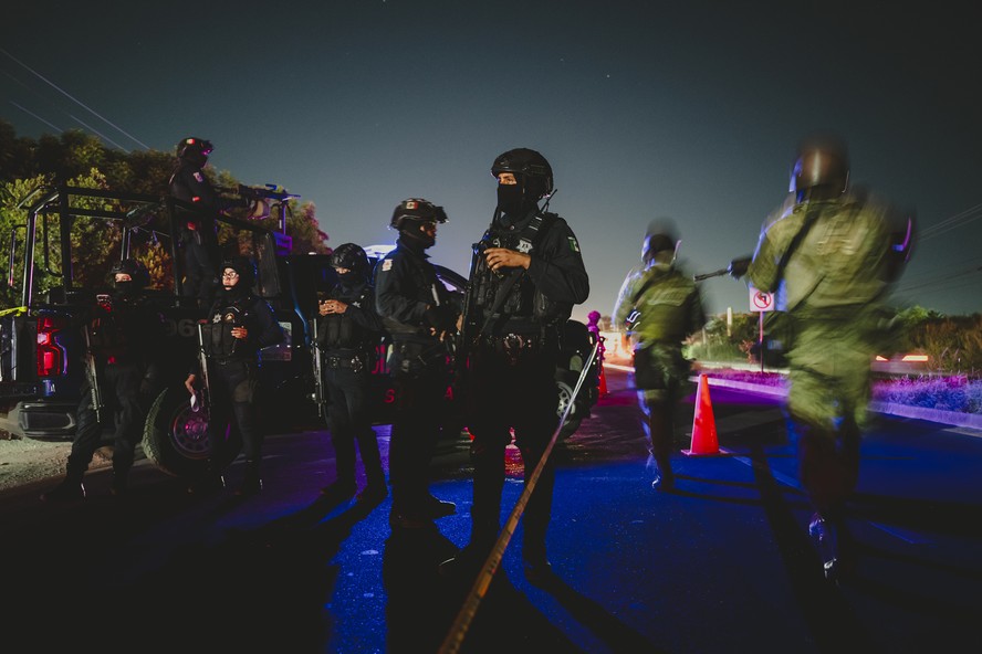Polícia guarda cena de crime onde os corpos de seis homens foram encontrados amontoados dentro de uma van branca em Culiacán,no México,em 27 de setembro de 2024 — Foto: Meridith Kohut/The New Yor
