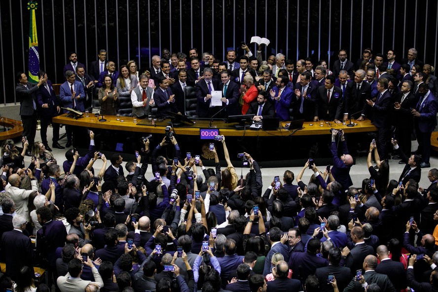 Eleição para presidência da mesa da Câmara dos Deputados. Arthur Lira deixa a presidência e Hugo Motta assume posição — Foto: Brenno Carvalho / Agência O Globo