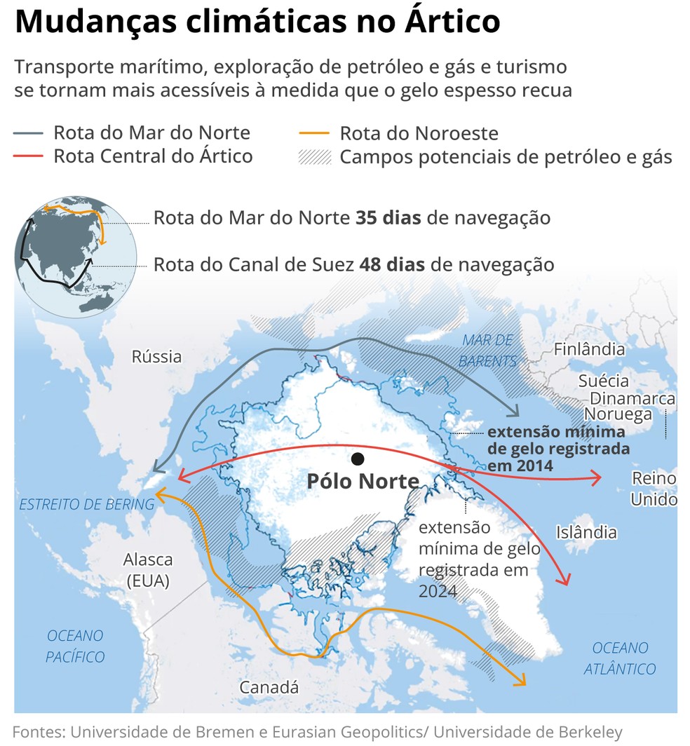 Antes,os Estados nórdicos lideraram um exercício de defesa conjunto com mais de 20 mil soldados de 13 países da Otan,voltado para proteger o flanco norte da aliança militar ocidental. EUA,Canadá e Finlândia também firmaram um acordo para incentivar suas indústrias a produzirem mais navios quebra-gelo,fundamentais para melhorar o policiamento e abrir caminho para navios mercantes nas regiões geladas da Terra.