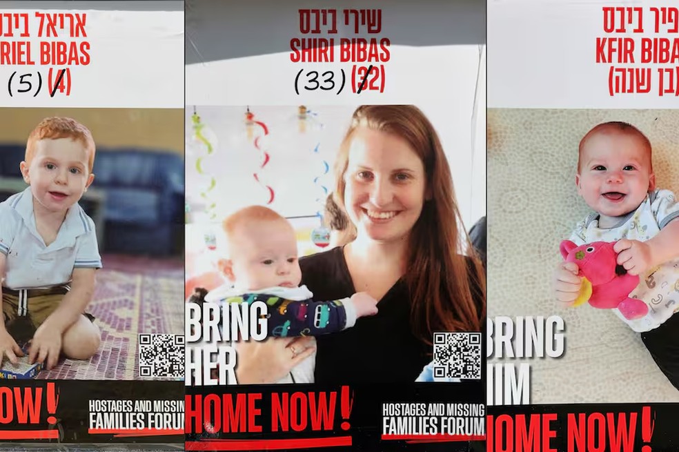 Cartazes com retratos dos reféns israelenses Shiri Bibas e seus dois filhos Ariel e Kfir; Os seus corpos foram entregues hoje pelo Hamas — Foto: AFP