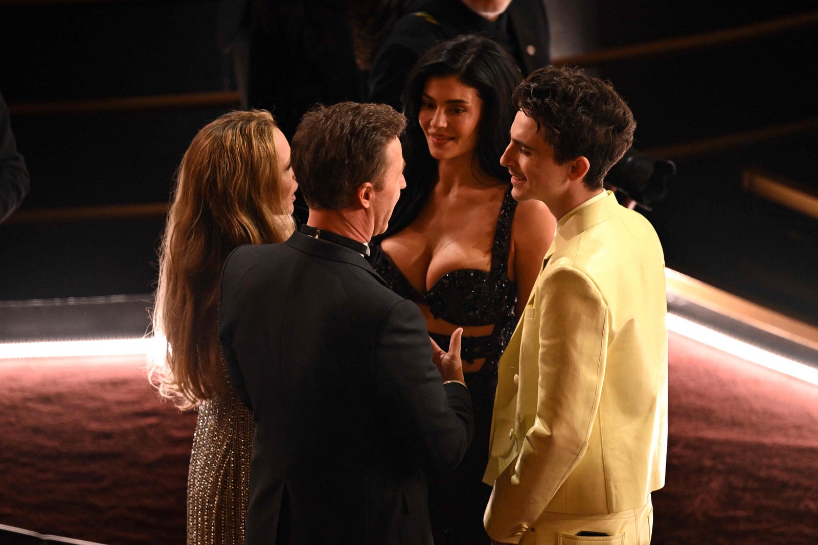 Rodinha de fofoca entre a produtora Shauna Robertson,o ator Edward Norton,a influencer Kylie Jenner e io ator Timothee Chalamet — Foto: Patrick T. Fallon / AFP