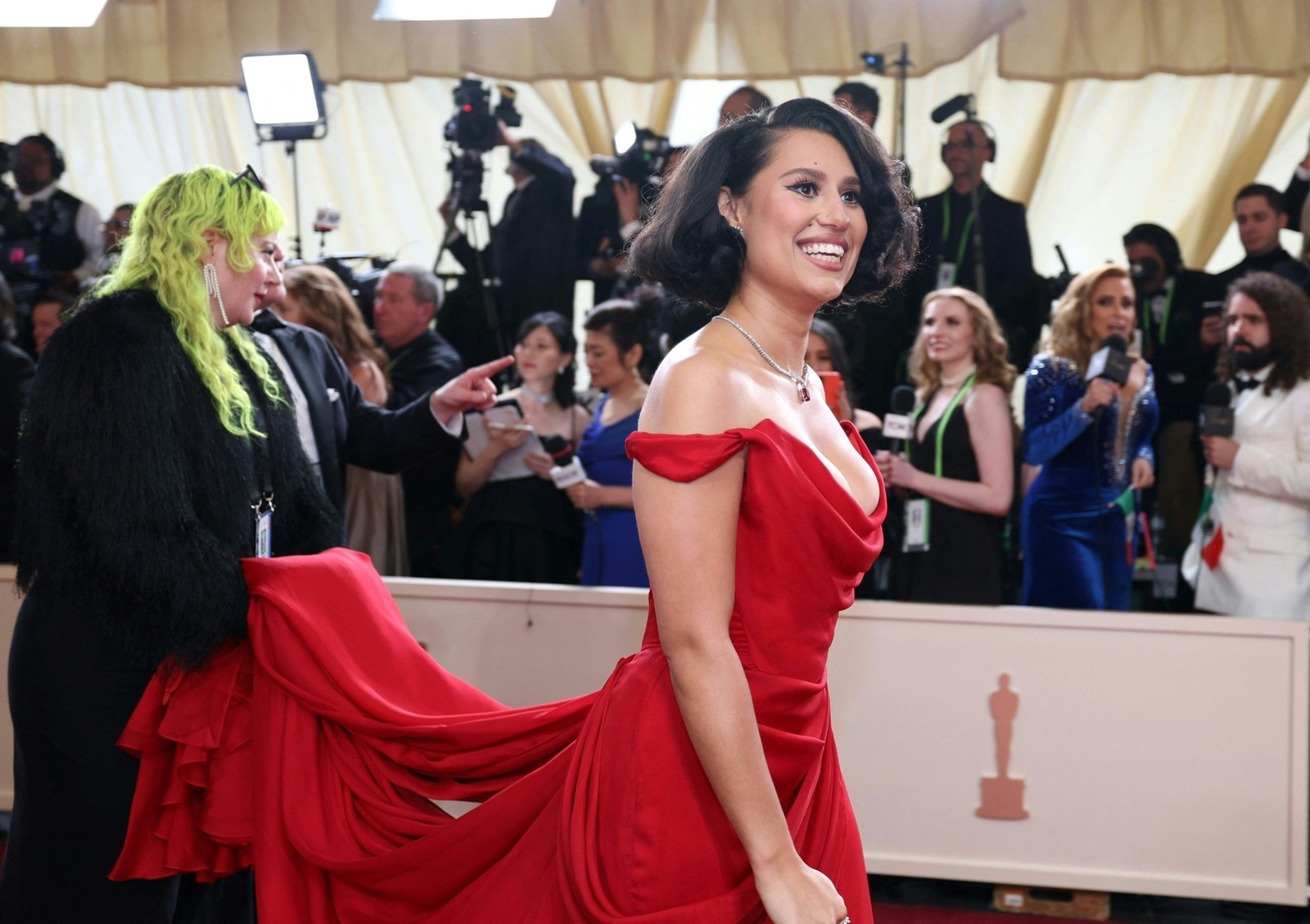 A cantora Raye conseguiu uma ajuda para carregar o vestido — Foto: VALERIE MACON / AFP