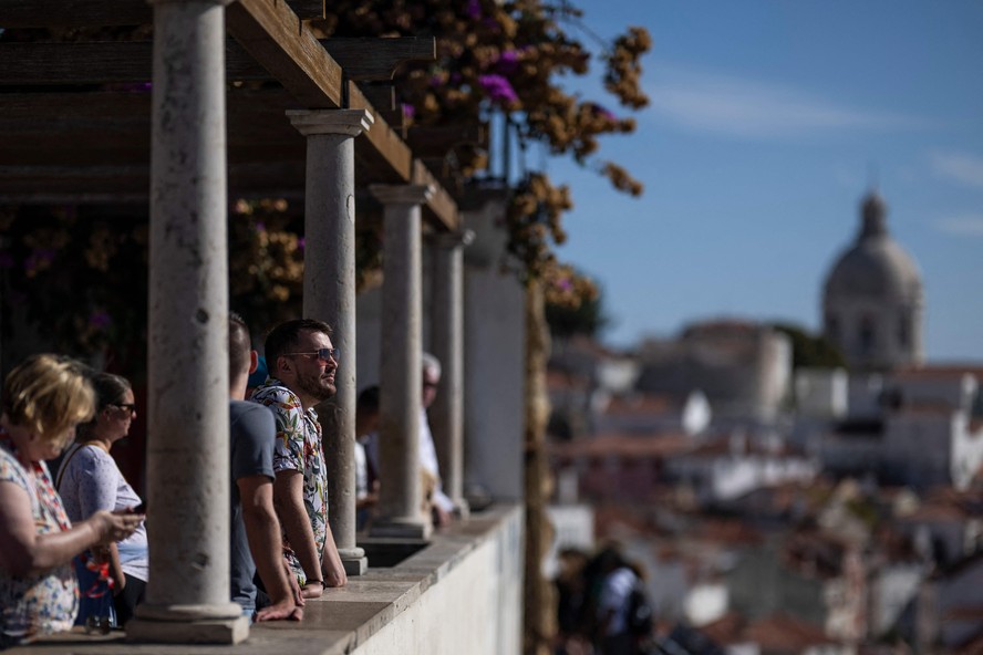 Visitantes e turistas no miradouro Santa Luzia,em Lisboa — Foto: Patrícia de Melo Moreira/AFP RESUMOSem tempo? Ferramenta de IA resume para você