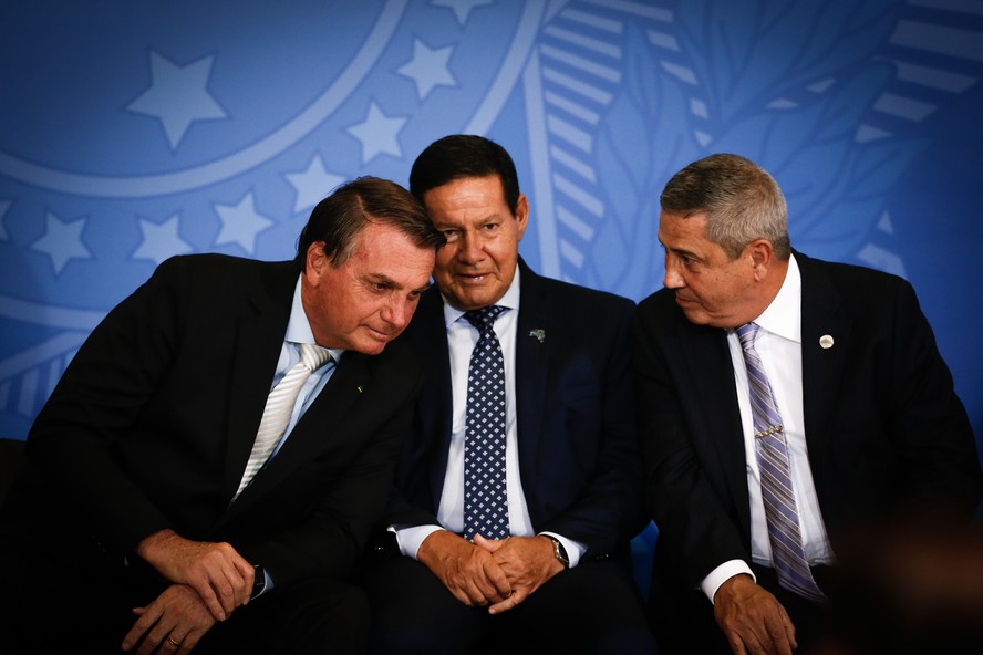 O presidente Jair Bolsonaro,o vice Hamilton Mourão e o então ministro Walter Braga Netto — Foto: Pablo Jacob/Agência O Globo
