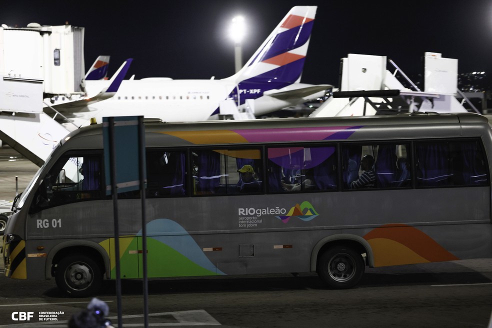 ônibus conduzindo novo técnico da seleção brasileira para fora da pista no aeroporto do Galeão — Foto: Rafael Ribeiro / CBF