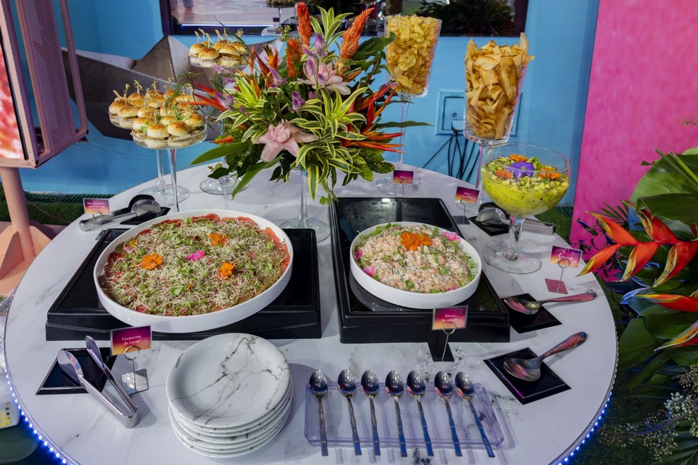 O GLOBO visitou,com exclusividade,os bastidores do evento,desta vez inspirado na novela das 21h “Três Graças”. Às 20h,pouco menos de duas horas de o reality show ir ao ar,o cenário já estava nos arremates finais. A montagem havia começado três horas antes; o bar,as mesas de comida,a pista de dança,lounge e área de entretenimento (no caso,uma câmera slow motion para criar o efeito da abertura da novela) já estavam prontos. As comidinhas (que não costumam ser repostas durante a festa,somente as bebidas) só seriam colocadas mais tarde,mas os réchauds para manter os pratos quentes já estavam instalados. O cardápio daquela noite,sempre baseado na preferência dos convidados,teve de tartar de salmão a estrogonofe de carne,passando por sanduíche de pernil com abacaxi,pudim de tapioca com banana caramelizada e crepe de brigadeiro com chocolate.