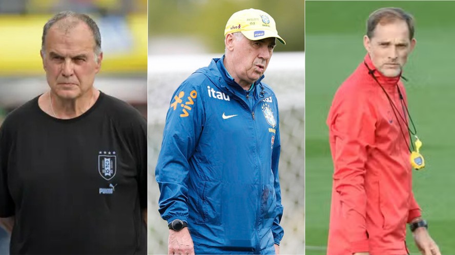 Marcelo Bielsa,Carlo Ancelotti e Thomas Tuchel são alguns dos técnicos estrangeiros na Copa do Mundo — Foto: AFP,Rafael Ribeiro/CBF e AFP
